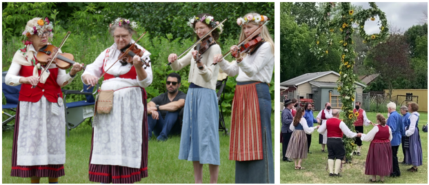 To celebrate Midsommar is to celebrate of the longest day of the year. The Midsommar festivities includes decoration of the Majstång (Maypole) with greens and flowers, a procession of raising the decorated pole led by Goda Vänner playing “I sommarens soliga dagar” (In the sunny days of summer) on violin. Then dancing around the majstång and singing the special Swedish songs like “små grodorna” (the little frogs) and “vi äro musikanter” (we are all musicians).
