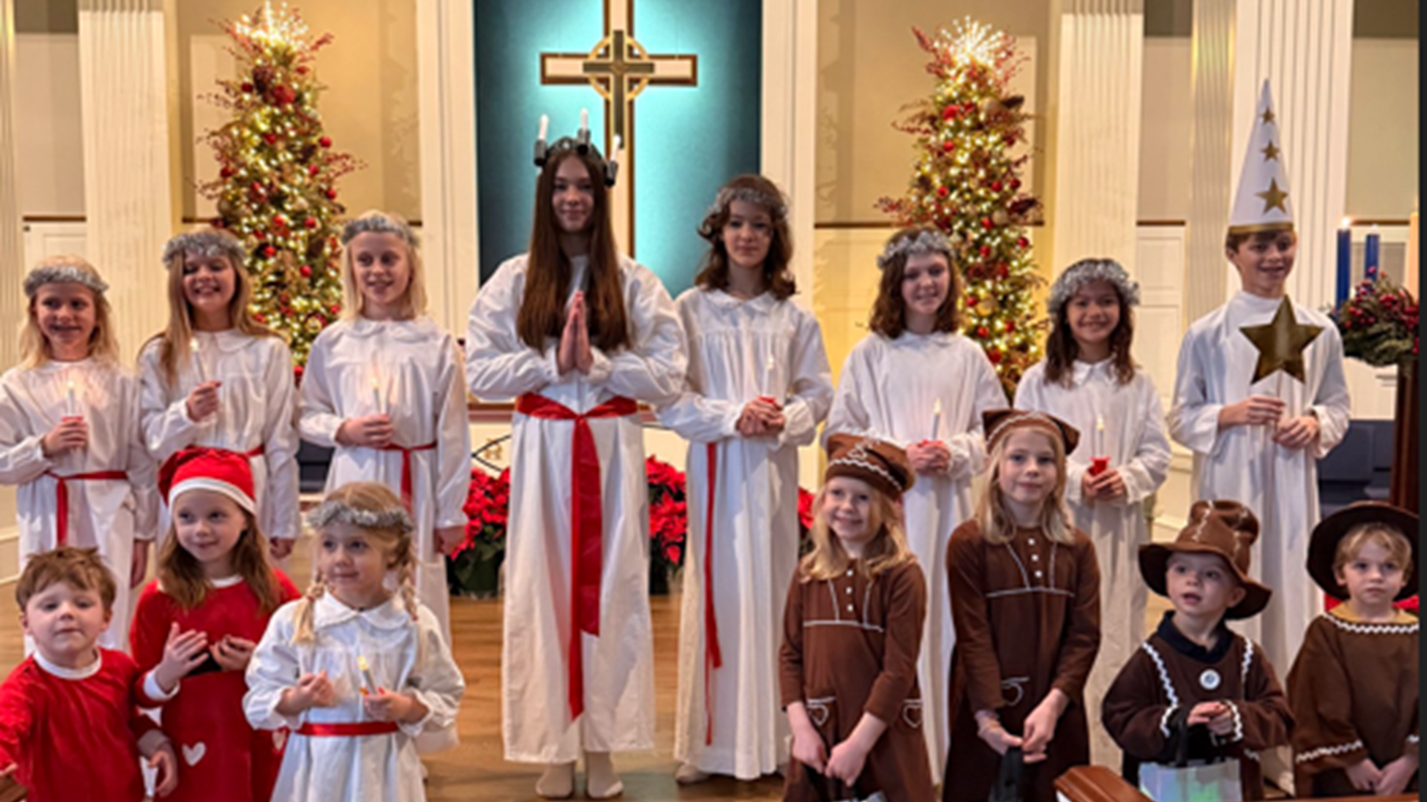 After a final rehearsal, the program could begin with the procession led by 2025 Lucia Madeleine Franke, followed by attendants, Leighton Ehrengren, Kenzie Klagmann, Ida Knox*, Ella and Emilia Lemery, Mila Leon, Thea Quealy, Villa Sjöberg, Layla Gallo, Starboys Camden Ehrengren, Joseph Kaltenberg*, Olof Knox*, Gingerbread men Arlo Ehrengren, Eli Kaltenberg*, Nora, Isla and Wilam Thode-Edström, and Little Santas Astrid and Oskar Erkander*, and Nova and Orion Balistreri. (* missing due to re-schedule)