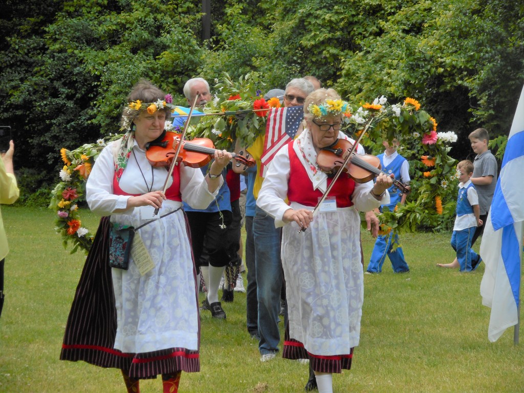 The celebration began with decorating and then a formal procession led by Goda Vänner violinists Mary Stetson and Carol Gustafson. The pole was raised and the dancing could begin.