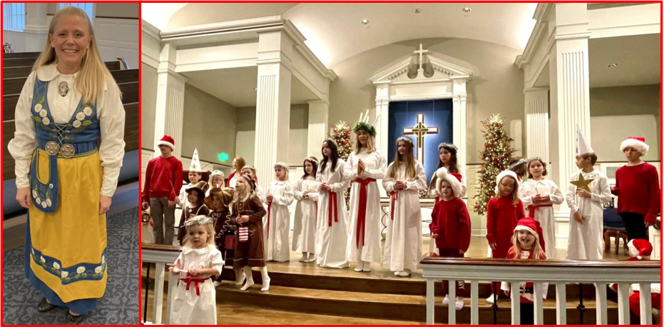 What a wonderful day it was!On December 17, 2023 Lucia Day Celebration was held in the beautiful Fox Point Lutheran Church. 25 children and teenagers participated in the Lucia program directed by Stina Lemery.Amanda Balistreri red the Lucia Story and introduced each song in the program and piano was played by Matt Byszynski. The Lucia Program was done together with the Swedish School of Milwaukee. 175 people attended the event.
