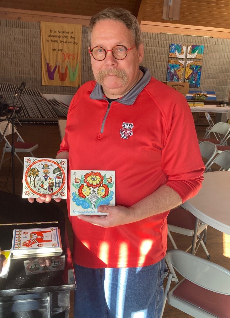 At the SAHSWI Fika meeting on October 21, 2022 John Elliott, SAHSWI Vice President discussed Berggren tiles, which are decorated in Swedish folk tradition style known as “Dalmålningar”. The Berggren tiles were made by Berggren Trayner company which was founded by Arthur and Audrey Berggren 1948. The company created silk screened ceramic and enamelware decals in Swedish style – decorative cookware, cutting boards, porcelain, china and ceramic tiles.