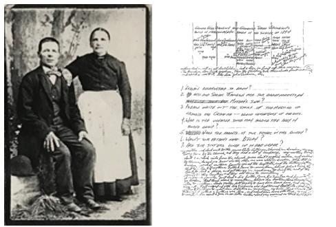 Brent: “This was written by Sarah Larson concerning her parents, Blom Olof (B.O.) Larson and Der Sara Ersdotter, daughter of Der Eric Jacobsson. (Blom and Der are Swedish farm names. It was common in the province of Dalarna, where they were born, to record the farm name (gårdsnamn) before a given name). B.O. and Sara lived with their parents in or near Dala-Järna prior to emigration. Sara Ersdotter emigrated with her parents and siblings to Wisconsin in 1883 and B.O. emigrated a little later in the same year. Sara Ersdotter and all her siblings changed their last name to Erickson in Wisconsin, and she added the letter h to her first name. Here is the story”