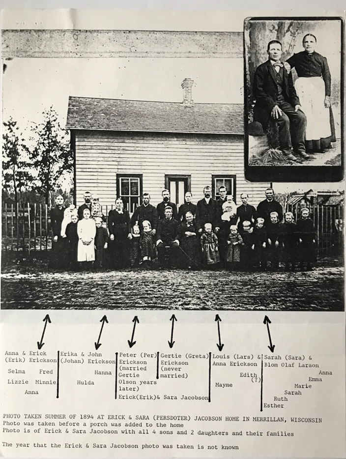 “My mother and dad (B.O. Larson and Sarah Erickson) went to the same state Lutheran church in Sweden, my dad living close to the church, and they had a lot of company. My mother lived about 1 Swedish mile from the church, guess about 7 English miles, and walked to church. So each one know who the other was while in Sweden. While still in Sweden, several of my mother’s family joined the Baptists, and the Lutherans thought that terrible. 2 of my mother’s family came to Merrillan (Wisconsin), believe John and Erick, the oldest, to find a place to get things in readiness to bring the rest of the family to this country, and (then) they all came to Merrillan. Of my dad’s (B.O.’s) family, just Dad (B.O.) and his brother came. His three sisters and parents stayed in Sweden. Dad came alone to Merrillan, believe his brother Lars Larson came later to Merrillan. Dad’s mother felt terrible to have him leave home, and she told him not to get mixed up with the Ericksons who had turned Baptist. Dad had written Peter Olson to meet him at (the railroad) station in Merrillan. No Peter there when he got off the train, but my mother’s 2 brothers were there and asked him home with them. He was glad to accept. And in about a year or so later Mother and Dad were married on April 6, 1885.”