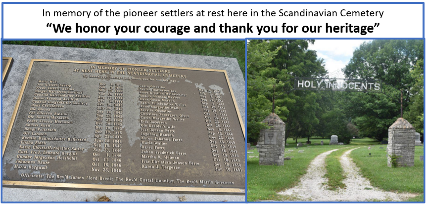 The tour then continued to the Holy Innocents Cemetery where Paul Turek, Chairman of the Cemetery Committee, St. Anskar’s Episcopal Church presented the history of cemetery and the Scandinavian Parish. In January of 1844 Bishop Jack Kemper visited New Upsala and in March the same year the Holy Innocents cemetery was consecrated for the Scandinavian community, and the Pine Lake Scandinavian Parish was established. Gustaf Unonius was ordained as its first pastor in 1845. A few years later a small church was built on the cemetery grounds.