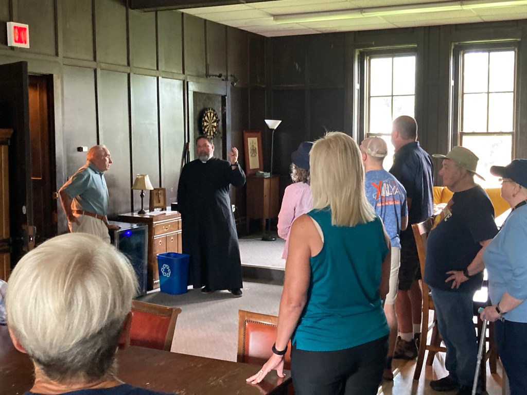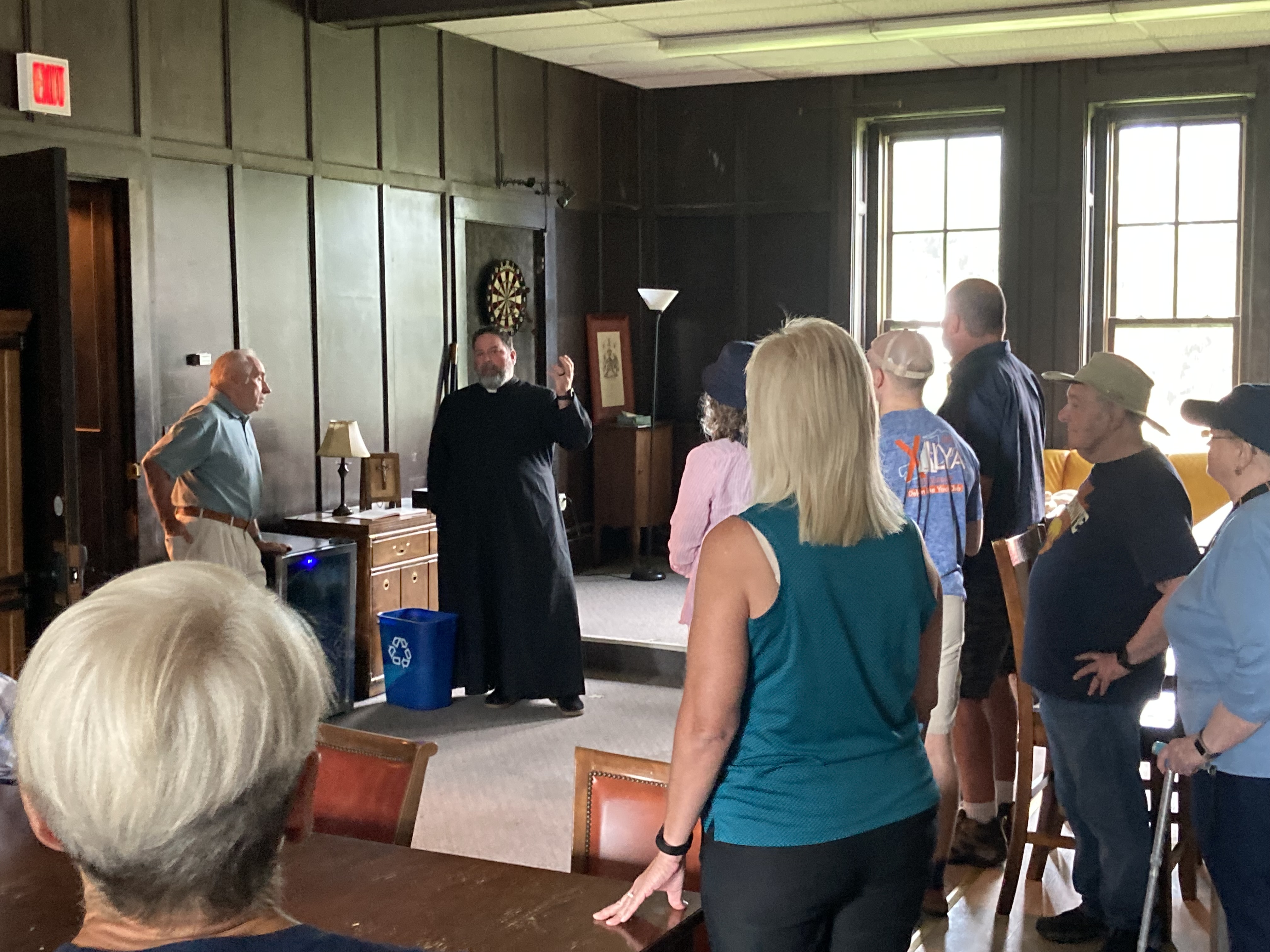 The 2023 tour started with Reverend Jason Terhune discussing the history of the Nashotah House Episcopal Seminary and leading a walking tour, starting at Shelton Hall, the student common room, and continued to the Chapel of St Mary, the Virgin, past Michael, the Bell Tower, and then to the Blue House, where the first students lived and the Red Chapel.